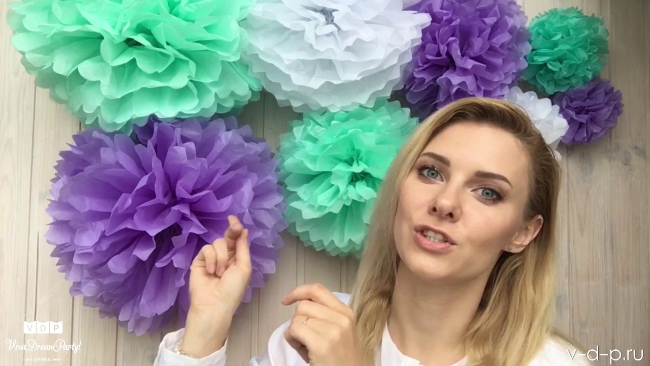 Помпон – декоративное украшение, выполненное из папирусной, гофрированной, креповой, упаковочной или тишью бумаги. Помпоны из бумаги тишью пользуются популярностью благодаря необычной шуршащей структуре материала и богатой цветовой гамме.