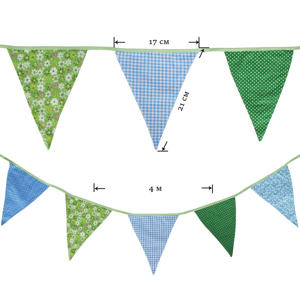 Гирлянда состоит из 12 флажков. Расстояние между флажками - 6 см, общая длина составляет 4 м.