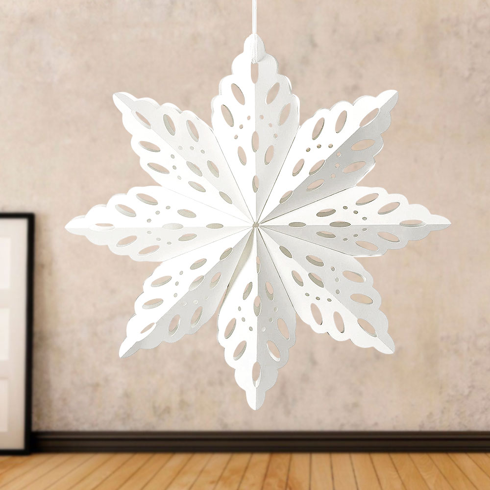 Элегантная объёмная снежинка из плотной бумаги белого цвета — изысканное украшение для зимнего интерьера, витрин, залов и новогодних фотозон. Ажурный рисунок придаёт ей лёгкость и воздушность, создавая ощущение снежной свежести и уюта.