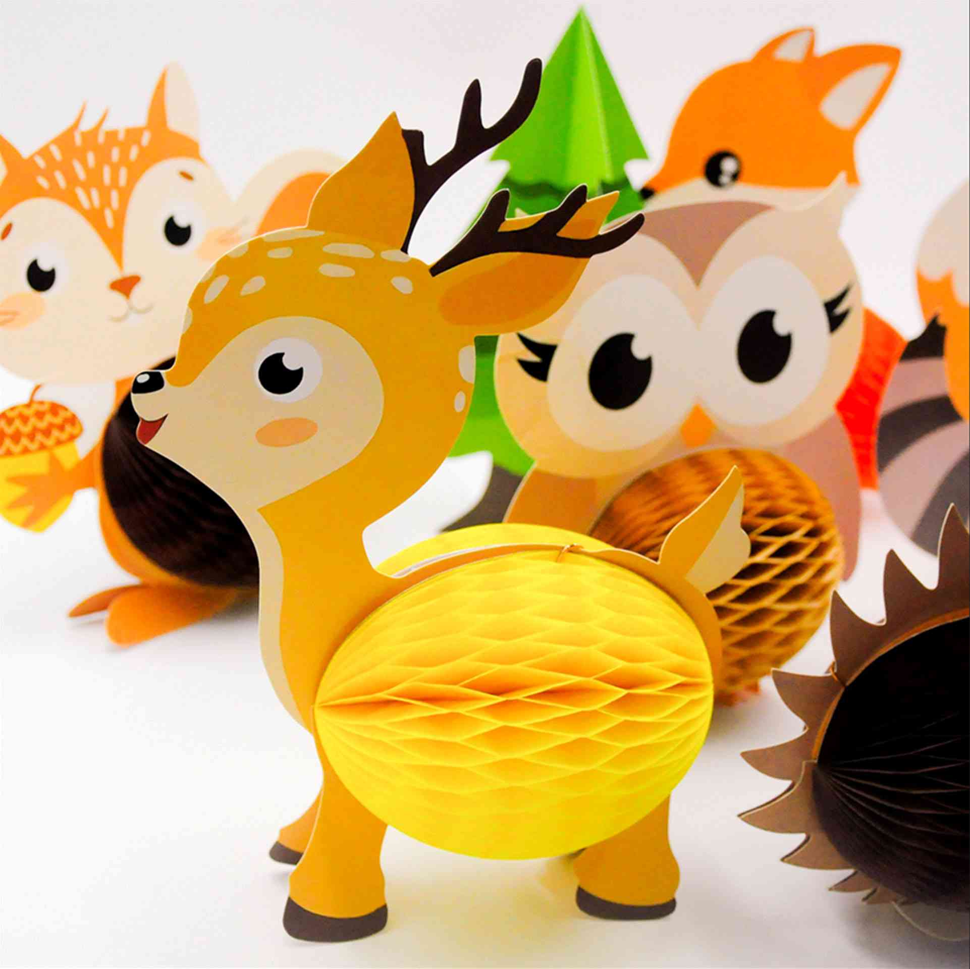 Стоячие сотовые украшения «Лес» — красочный набор декоративных фигурок с лесными животными, который создаст атмосферу уюта и сказки на детском празднике. Украшения отлично подойдут для оформления стола, фотозоны или игровой зоны.